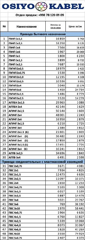 Прайс-лист на кабели, провода, эмальпровод, лампы, розетки, пускатели и на другие электротехнические товары в Узбекистане. Osiyo Kabel.